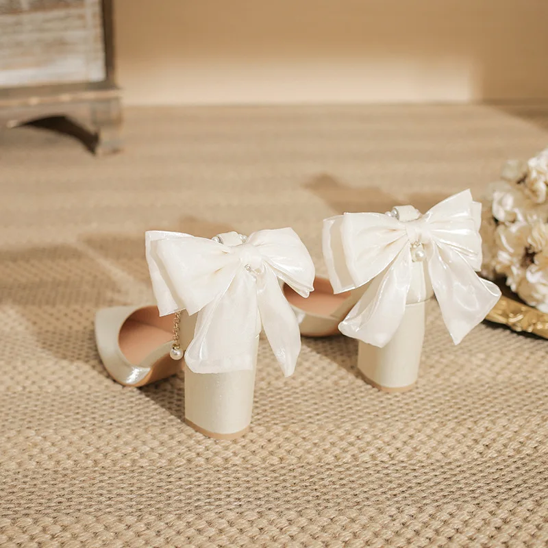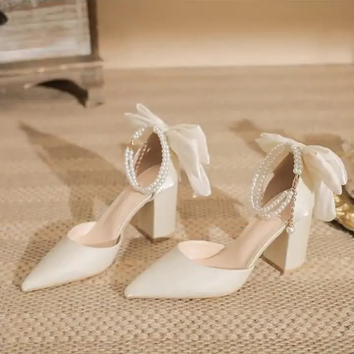 Slimming Shoes Casual Heels Shallow Mouth Sandals Ladies Pointed Pumps Hollow 2023 All-Match Comfortable Beige African Bow Toe S
