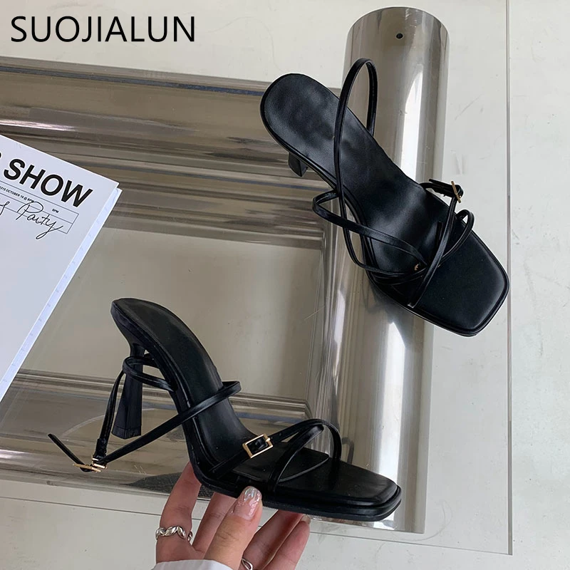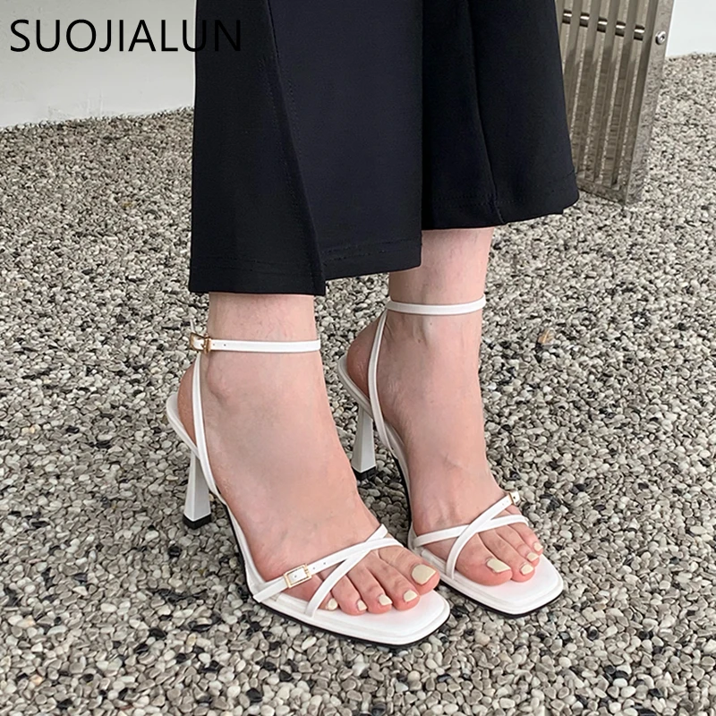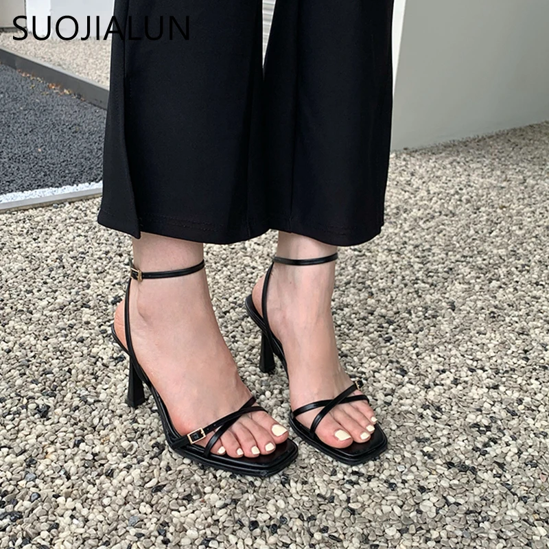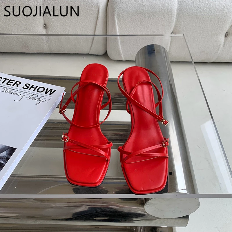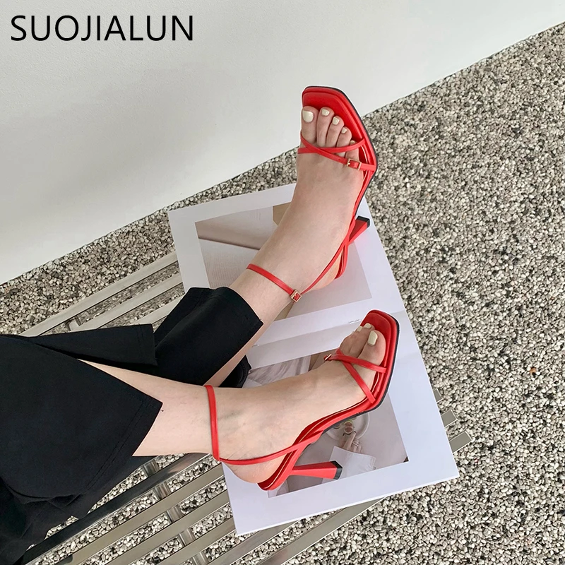 SUOJIALUN 2023 Summer New Women Sandal Shoes Fashion Red Narrow Band Ladies Elegant Gladiator Shoes Thin High Heel Dress Pumps S